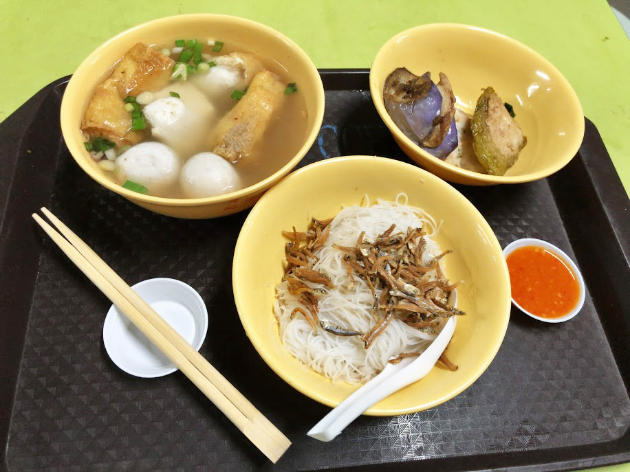 こちらはメニューは2種類。具を6つ+麺か、8種類のみで具は選べません。麺の種類はビーフン・クウェイティヤオ(米の太麺)・イエローヌードル(中華麺)の3つ。今回は6つ+ビーフンにフィッシュケーキ・ゴーヤ・ナスを追加注文。店員さんの対応は丁寧で感じがいいですが、そのぶん列の進みは遅いです。